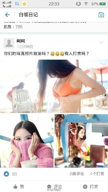 这张19个人赞赏单手支着头发怔照片,在百度贴吧遍地都是: